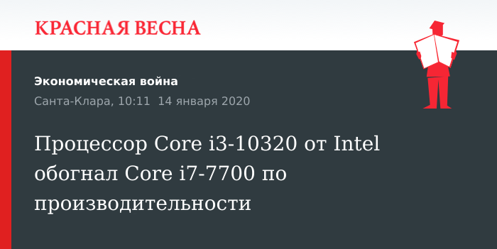 Новый процессор Intel Core i3-10320 десятого поколения обошел по производительности процессор седьмого поколения Intel Core i7-7700, сообщает 13 января портал о компьютерном «железе» iXBT.com.
