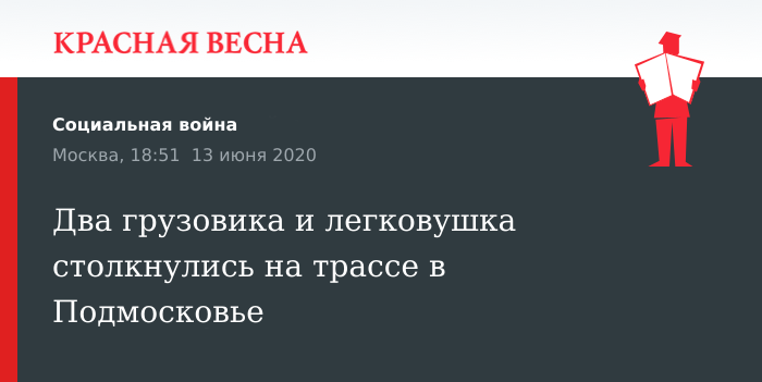 Двое человек пострадали в результате столкновения двух грузовиков и легкового автомобиля на трассе в Подмосковье, сообщили в пресс-службе областного главка МВД 13 июня в комментарии РИА Новости.