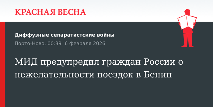 Как сообщает МИД, после декабрьской попытки госпереворота 2025 года и продолжающихся террористических актов экстремистов в северных районах Бенина местные правоохранительные органы работают в усиленном режиме. Особое внимание уделяется контролю за прибытием и перемещением иностранных граждан по территории страны.