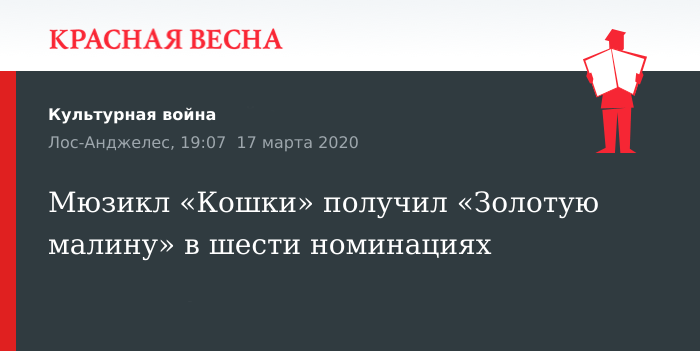 Шесть антинаград получил мюзикл «Кошки» на церемонии вручения антипремии «Золотая малина», 17 марта сообщает телеканал «Культура».