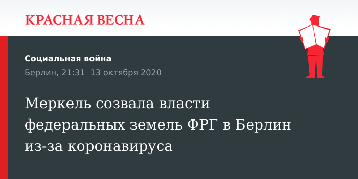 Напомним также, ранее немецкое издание Bild привело слова руководителя администрации бундесканцлера ФРГ Хельге Брауна, который обосновал необходимость очной конференции премьер-министров крайне тяжелым положением с распространением инфекции в стране. По его мнению, есть необходимость провести открытые дебаты, которые могут иметь «исторические масштабы».