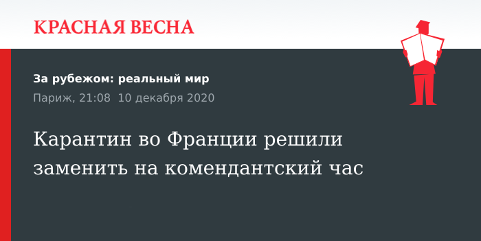 Этот режим будет начинаться с 20:00 до 06:00 (22:00 до 08:00 мск). Он заменит всеобщий карантин, действующий на всей территории Франции с 30 октября из-за пандемии COVID-19.