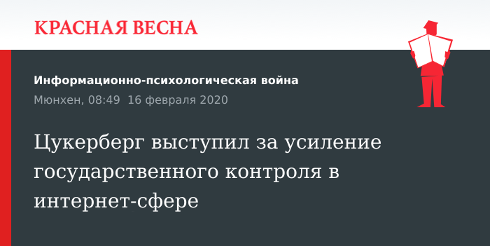 В интернет-сфере должен присутствовать частичный контроль со стороны государств, заявил владелец социальной сети Facebook Марк Цукерберг 15 февраля в своем выступлении на Мюнхенской конференции по безопасности.