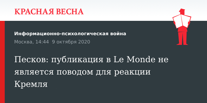 Публикация во французской газете Le Monde в связи с «отравлением» Алексея Навального не является поводом для какой-либо реакции Кремля, заявил пресс-секретарь президента РФ Дмитрий Песков 9 октября в ходе общения с журналистами.
