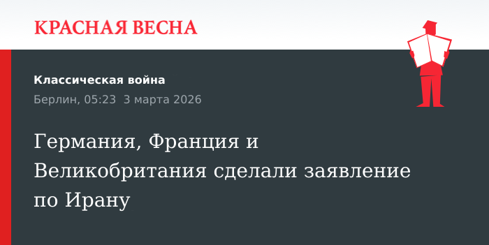 Германия, Франция и Великобритания призвали Иран прекратить ракетные обстрелы на Ближнем Востоке и оставили за собой право на оборонительные военные меры, заявил канцлер Германии Фридрих Мерц, сообщает 2 марта «Штерн».