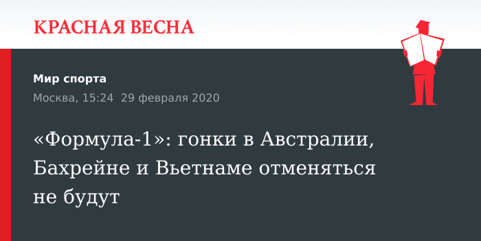 Владельцы «Формулы-1» заявили, что Гран-при Австралии, Бахрейна и Вьетнама состоится согласно утвержденному календарю гоночных этапов чемпионата. По их словам, приезжающих на этапы из Италии будет встречать спецкоманда. Она организует врачебную проверку этих людей на коронавирус в течение трех часов.