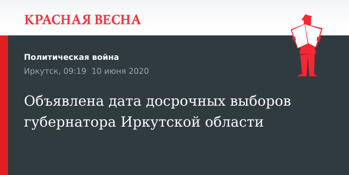 «Законодательное Собрание на 31-й сессии, которая проходит сегодня под председательством Александра Ведерникова, приняло постановление о проведении досрочных выборов губернатора Иркутской области 13 сентября 2020 года», — говорится в сообщении.