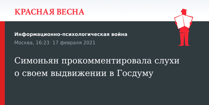 Сообщения о выдвижении своей кандидатуры в депутаты Госдумы РФ от партии «Единая Россия» опровергла главный редактор МИА «Россия сегодня» и RT Маргарита Симоньян, об этом она написала 17 февраля в Telegram-канале.