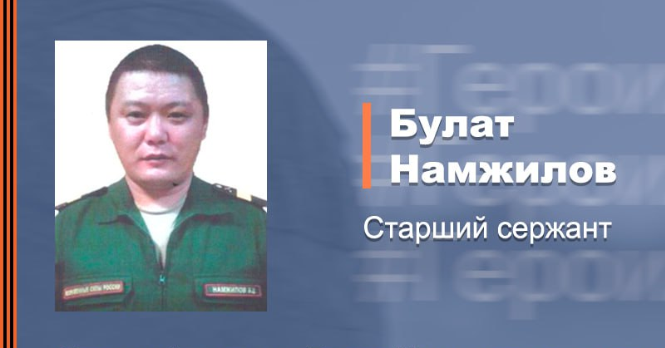Согласно сообщению, старший сержант Булат Намжилов в составе реактивного артиллерийского взвода поддерживал наступление российских войск. В ходе боя его расчет точным ударом уничтожил боевую машину пехоты и большое количество живой силы неонацистов.
