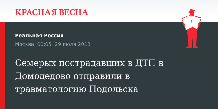 В сообщении говорится: «По состоянию на 19:15 в результате ДТП в городском округе Домодедово с участием пассажирского автобуса пострадали 20 человек, среди которых один ребенок. Тринадцать человек находятся в Домодедовской больнице, еще семь человек будут эвакуированы в травмцентр города Подольск. Пострадавшим оказывается вся необходимая медицинская помощь».