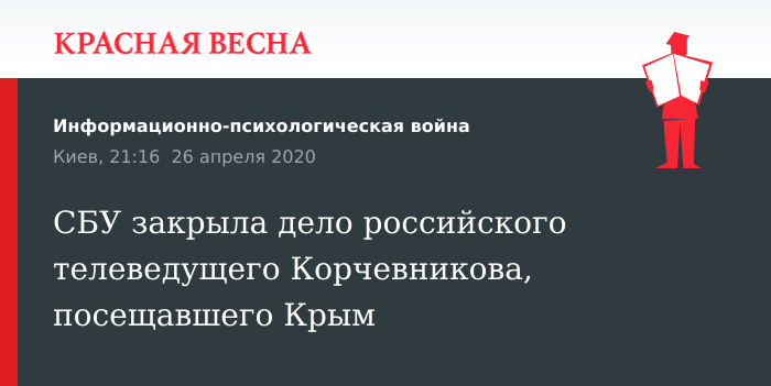 Уголовное производство в отношении телеведущего канала «Россия-1» и генерального директора православного телеканала «Спас» Бориса Корчевникова было закрыто Службой безопасности Украины (СБУ). Об этом 26 апреля говорится в ответе СБУ на запрос издания «Крым. Реалии» (СМИ-иностранный агент).