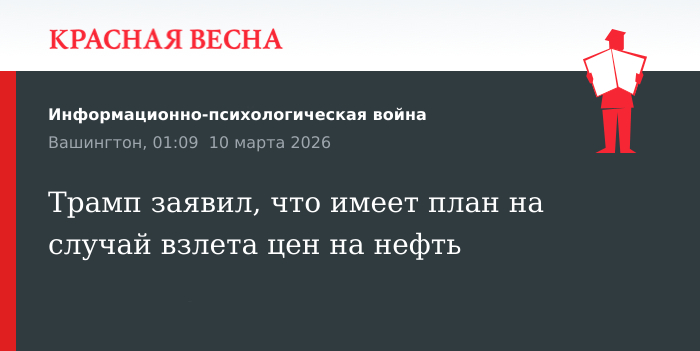 В телефонном интервью Трамп, в частности, прокомментировал ситуацию с резким скачком цен на нефть, стоимость которой на фоне конфликта с Ираном приближалась к $120 за баррель. «У меня есть план на все, ясно? У меня есть план на все. Вы будете очень довольны», — заявил президент США. Дональд Трамп не уточнил, в чем заключается план. По мнению авторов газеты, США могут воспользоваться стратегическими резервами нефти.