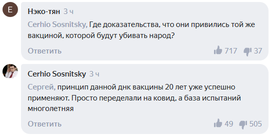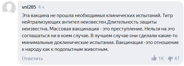 Пользователи Сети считают, что нельзя проводить вакцинацию препаратом, который еще не прошел полного цикла проверки.