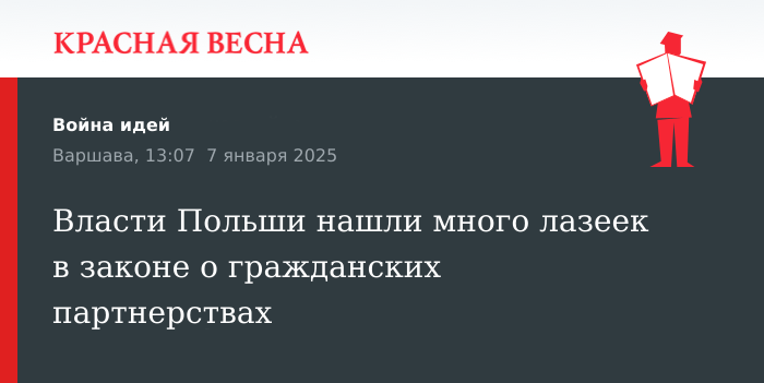Напомним, предложенный польским министром равноправия Катаржиной Котулой законопроект о гражданских партнерствах в первую очередь решает предвыборное обещание социал-демократической партии «Новая левица» расширить права агрессивного меньшинства ЛГБТ (организация, деятельность которой запрещена в РФ). «Новая левица» вошла в правящую коалицию с либералами и центристами под договоренность принять данный закон, хотя некоторые депутаты-центристы смотрят с сомнением на практику гражданских партнерств.