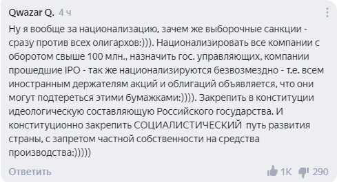 Самое большое количество положительных оценок — более тысячи — набрал комментарий, призывающий «закрепить социалистический путь развития» и запретить частную собственность на средства производства, а также национализировать крупные компании.