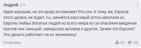 Пользователь Андрей считает, что идея хорошая, но Европа этого не сделает, т.к деньги российских олигархов работают на нее.