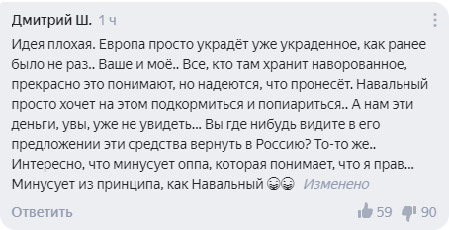 Комментатор Дмитрий не согласен с Андреем и считает, что России в любом случае наворованных денег уже не увидеть. А Навальный, по его мнению, просто хочет руки погреть на этом.