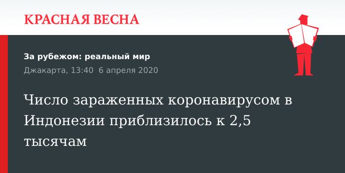 Общее число случаев заражения коронавирусной инфекцией в Индонезии достигло 2491, передает 6 апреля издание Jakarta Post.