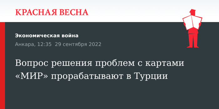 В Турции идет проработка вероятных путей решения проблем, возникающих при использовании карт российской системы «МИР», сообщили 29 сентября в Ростуризме.