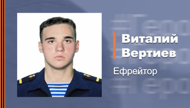 Мужество, самоотверженность и высочайший боевой дух ефрейтора Виталия Вертиева, несмотря на ранение сковавшего огнем отряд ВСУ, позволило одержать победу в бою и освободить населенный пункт в ходе выполнения спецоперации по освобождению Донбасса и денацификации Украины. Об этом 30 апреля сообщила пресс-служба Минобороны РФ.