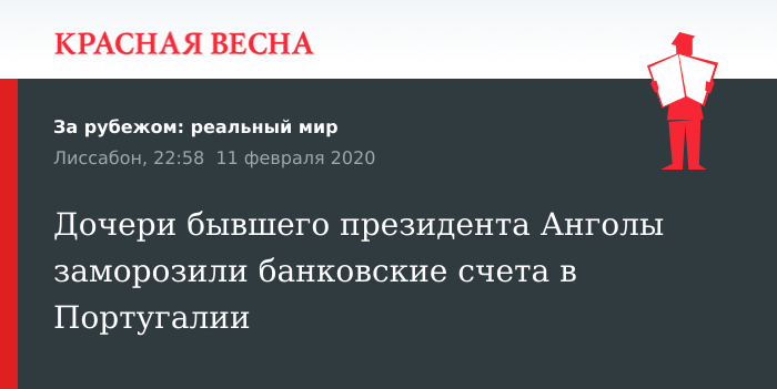 Власти Португалии заморозили все банковские счета Изабель душ Сантуш по запросу властей Анголы, 11 февраля сообщает государственная медиагруппа Radio e Televisao de Portugal (RTP).