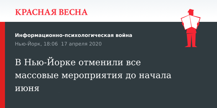 Все концерты, фестивали и все другие несущественные мероприятия в течение мая в Нью-Йорке были отменены с целью препятствования распространению коронавируса, заявил мэр города Билл де Блазио в ходе пресс-конференции 17 апреля, сообщает CNBC.
