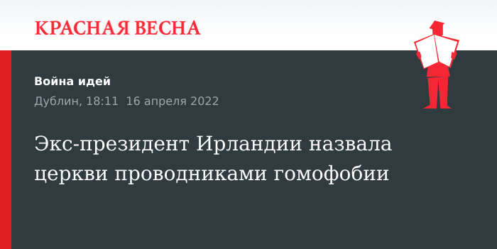 «Проводниками гомофобии» назвала религиозные учреждения Ирландии бывшая президент Ирландии Мэри Макалис, 16 апреля пишет The Irish Independent.