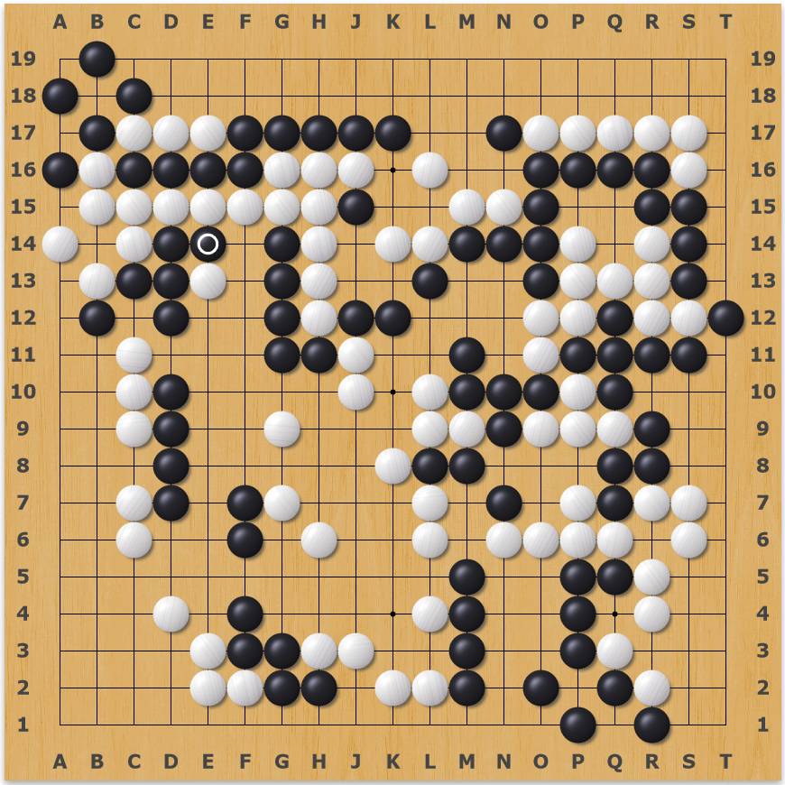 Решающей позицией игровой алгоритм KataGo считает ход белых в D11 и ответ черных в E14, после которых система показала, что черные лишаются преимущества в 9 очков, а белые приобретают отрыв в 3 очка.