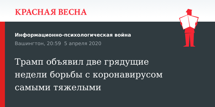 «Нам предстоит тяжелейшая неделя в течение этой и следующей недель», — заявил о борьбе с коронавирусом президент США Дональд Трамп 4 апреля на брифинге целевой группы по коронавирусу при Государственном департаменте.