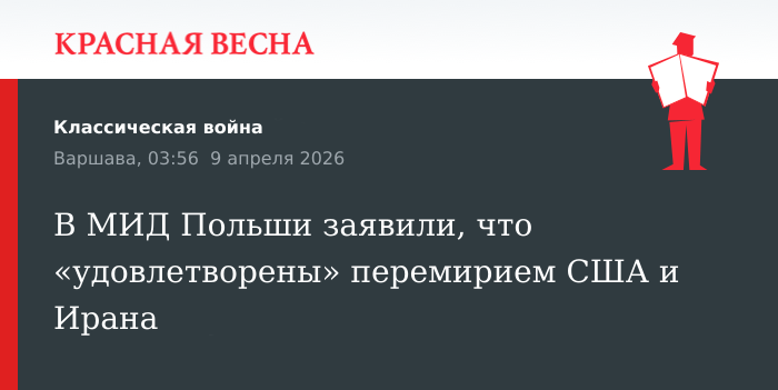 Польша «с удовлетворением приняла» объявленное перемирие между США и Ираном, но выражает обеспокоенность в связи с угрозой суверенитета и территориальной целостности Ливана, заявили в МИД страны, 8 апреля сообщает польское издание Kresy.