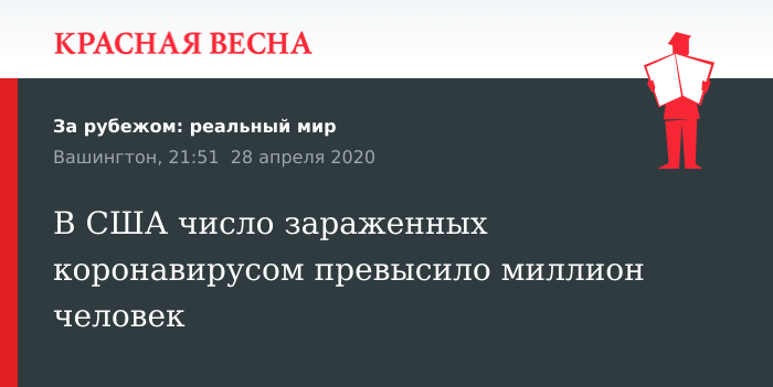 В США уровень заражения инфекцией коронавируса переступил миллионный порог, 28 апреля сообщает Университет Джонса Хопкинса на своем интернет-ресурсе.