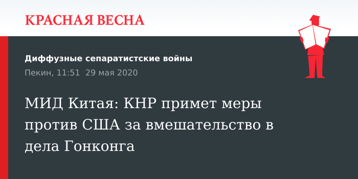 Напомним, 26 мая министр иностранных дел РФ Сергей Лавров заявил, что вопрос по Гонконгу, вокруг которого раздувают проблемы представители гонконгской оппозиции и некоторые западные страны, относится к внутренним делам Китая. Китайские коллеги 27 мая приветствовали позицию России, высказанную главой МИД РФ.