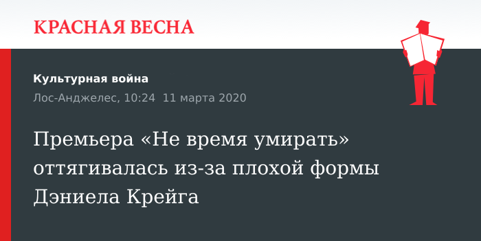Напомним, премьера нового фильма о Джеймсе Бонде «Не время умирать» состоится в ноябре 2020 года. Ранее выход фильма был запланирован на 3 апреля, но из-за эпидемии коронавируса релиз перенесли.