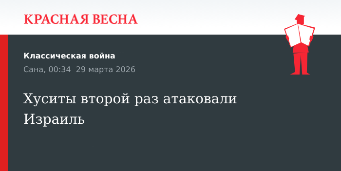 Второй за сутки удар по Израилю нанесли хуситы, заявил официальный представитель движения «Ансар Алла» Яхья Сариа, 28 марта заявление опубликовано в его Telegram-канале.