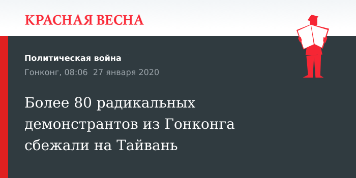 Более 80 радикальных демонстрантов, подозреваемых в штурме законодательного собрания Гонконга и других радикальных действиях, бежали на Тайвань, где укрываются от правосудия, 27 января сообщает South China Morning Post, ссылаясь на источники в полиции.