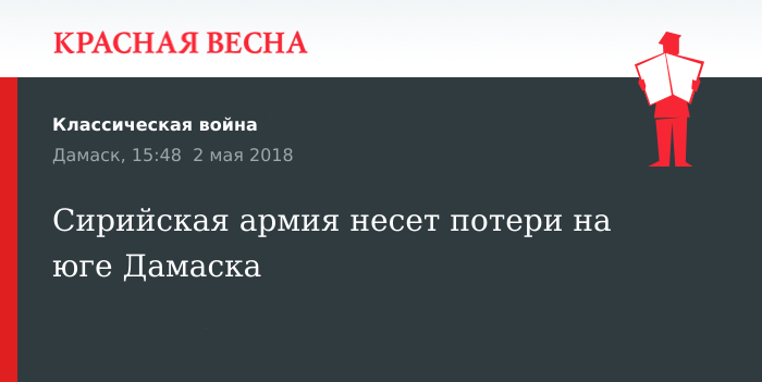 Напомним, на юге Дамаска, преимущественно в районе лагеря Ярмук и городка Аль-Хаджр Аль-Асуад, в настоящее время ведутся ожесточенные бои между Сирийской арабской армией и вооруженными террористическими группировками, как с «Тахрир Аш-Шам», так и с ИГ (организации, деятельность которых запрещена в РФ). По данным сирийского информагентства САНА, сирийская армия несет крупные потери на этом направлении, однако продвигается вперед.