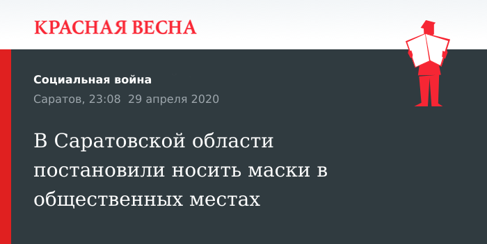 Жители Саратова и других городов области до 11 мая должны будут «носить лицевые маски в общественных местах». Согласно постановлению областного правительства к таким местам относятся организации, общественный транспорт и учреждения.