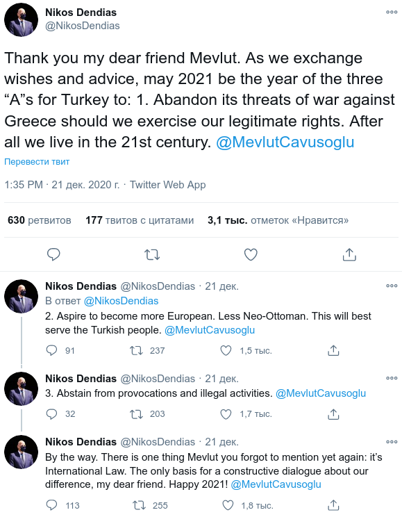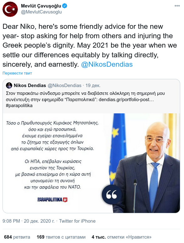«Дорогой Никос, вот несколько дружеских советов на Новый год: прекратите просить помощи у других и оскорблять достоинство греческого народа», — написал Чавушоглу. Он призвал урегулировать споры Греции и Турции в диалоге, «прямо, искренне и серьезно».