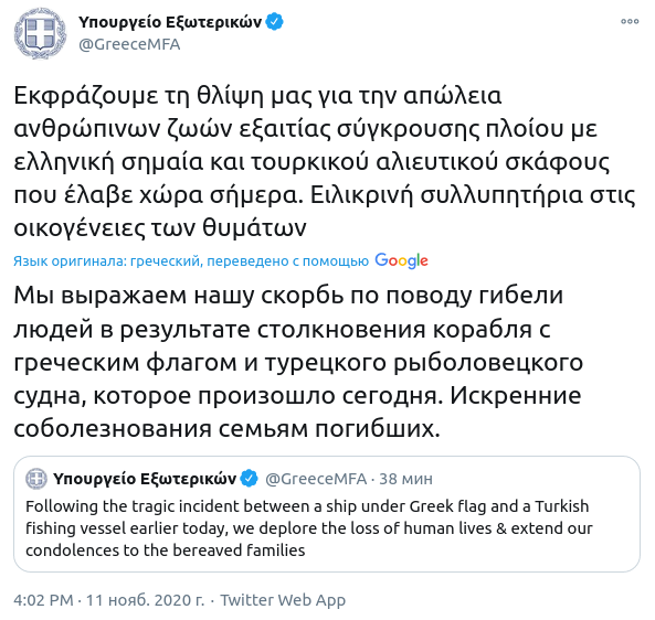 Скорбь в связи с гибелью людей в результате столкновения турецкого рыболовного катера с греческим танкером выразила пресс-служба МИД Греции 11 ноября в своем Twitter.