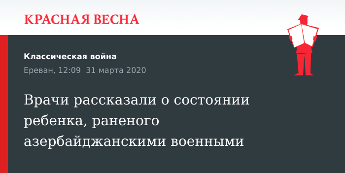 «Он находится в реанимационном отделении МЦ „Сурб Аствацамайр“. Необходимости во второй операции врачи на данный момент не видят. Ребенок получил огнестрельное ранение со стороны противника в области грудной клетки, на месте была оказана первая необходимая медицинская помощь. В медицинском центре Ноемберяна была проведена операция».