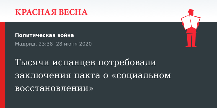 Требование заключить пакт о «социальном восстановлении» после пандемии коронавируса предъявили властям Испании по всей стране тысячи человек, 27 июня сообщает RTVE.