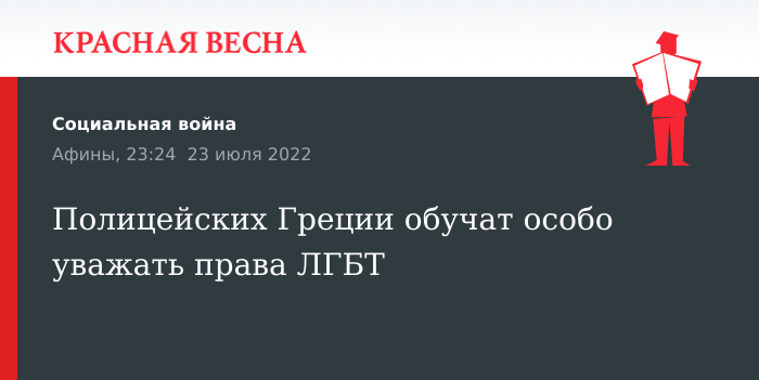Штаб полиции Греции издало особый приказ по защите прав представителей ЛГБТ. Как пишет газета, весь персонал полиции должен под роспись ознакомиться с правовыми рамками «защиты прав человека, особенно в том, что касается представителей ЛГБТ+».