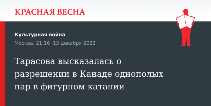 «Такого не было никогда, чтобы выходили мужчина с мужчиной и катались будто это мужчина и женщина. Что за бред такой, этого нет в правилах, хорошо, что мы не в Канаде живем», — отметила Тарасова.