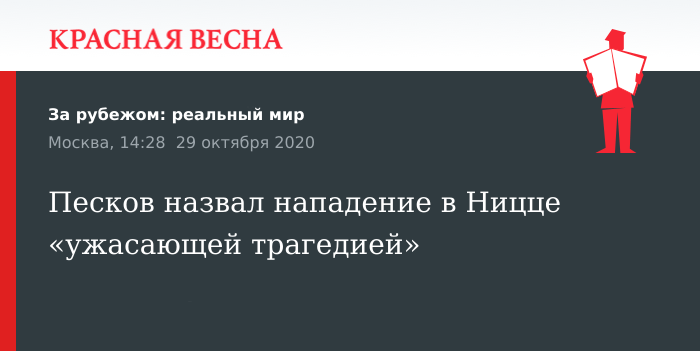Ужасающей трагедией назвал нападение на людей в церкви Нотр-Дам в Ницце пресс-секретарь президента РФ Дмитрий Песков, 29 октября об этом он заявил в присутствии журналистов.