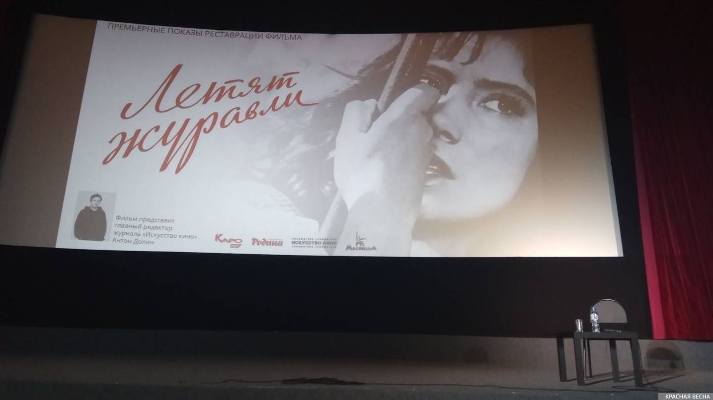 Напомним, проект «Синематека: Искусство Кино» — цикл кинопоказов, сопровождающихся лекциями кинокритиков. Проект организован журналом «Искусство кино». Целью проекта является возвращение любителей авторского кино к просмотру и дискуссиям в кинозале. Очередные кинопоказы состоялся 5 мая в киноцентре «Родина», на котором демонстрировался фильм режиссера Михаила Калатозова «Летят журавли».