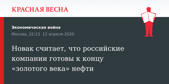 Конец «золотого века» обычной торговли нефтью не застанет врасплох российские компании — они готовы к нему, заявил глава минэнерго РФ Александр Новак 12 апреля в программе «Воскресный вечер с Владимиром Соловьевым» в эфире телеканала «Россия-1».