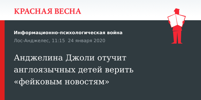 Ведущей телепередачи, обучающей детей борьбе с так называемыми «фейковыми новостями», станет американская киноактриса Анджелина Джоли, 23 января сообщает Variety.