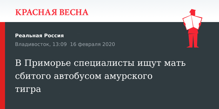 Напомним, 16 февраля рейсовый автобус сбил в Приморском крае молодого амурского тигра. Через некоторое время после столкновения, животному удалось встать на ноги и уйти в лес. Тем не менее, для тигра ранение оказалось смертельным. Позже тело животного нашли специалисты Охотнадзора.