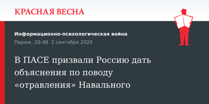 Пролить свет на отравление российского блогера Алексея Навального от российских властей потребовали содокладчики Парламентской ассамблеи Совета Европы по мониторингу Российской Федерации Аксель Шаффер (Германия, политгруппа социалистов) и Риа Оомен-Руйтен (Нидерланды, политгруппа Европейской народной партии), сообщает пресс-служба ПАСЕ 2 сентября на официальном сайте.