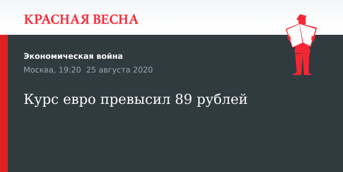 Курс евро по отношению к рублю превысил уровень в 89 рублей, 25 августа свидетельствуют данные торгов на Московской бирже.